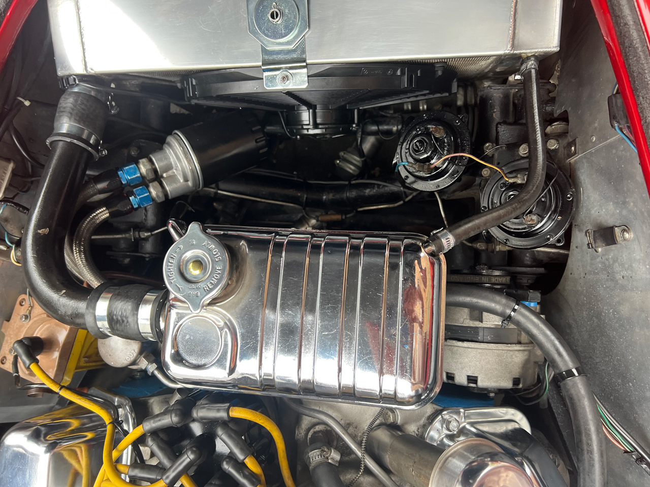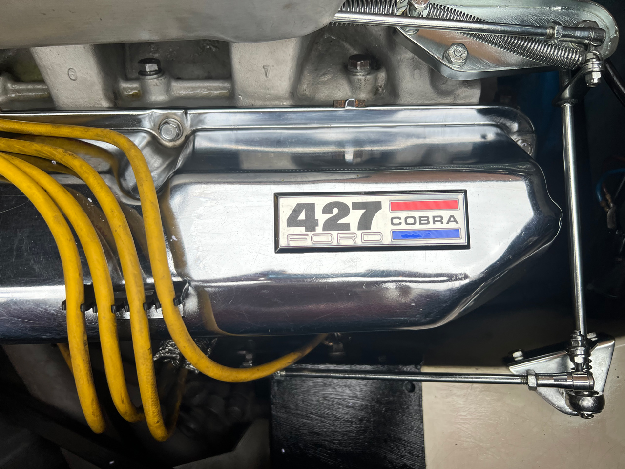 • Engine: Period-correct FE 427 V8. The block, intake, and heads are correct for a 1966–1967 factory 427; there is no block ribbing suggestive of a warranty replacement casting. The engine starts and runs well, with no smoke cold or warm. Occasional “spit” between shifts is noted and likely addressable through routine service (carburetor, plugs, air filter, etc.). Minor oil seepage at valve-cover gaskets is reported. The coil and wiring are replacements (period-style upgrades), and the coolant tank is presently chrome (original finish was black).
